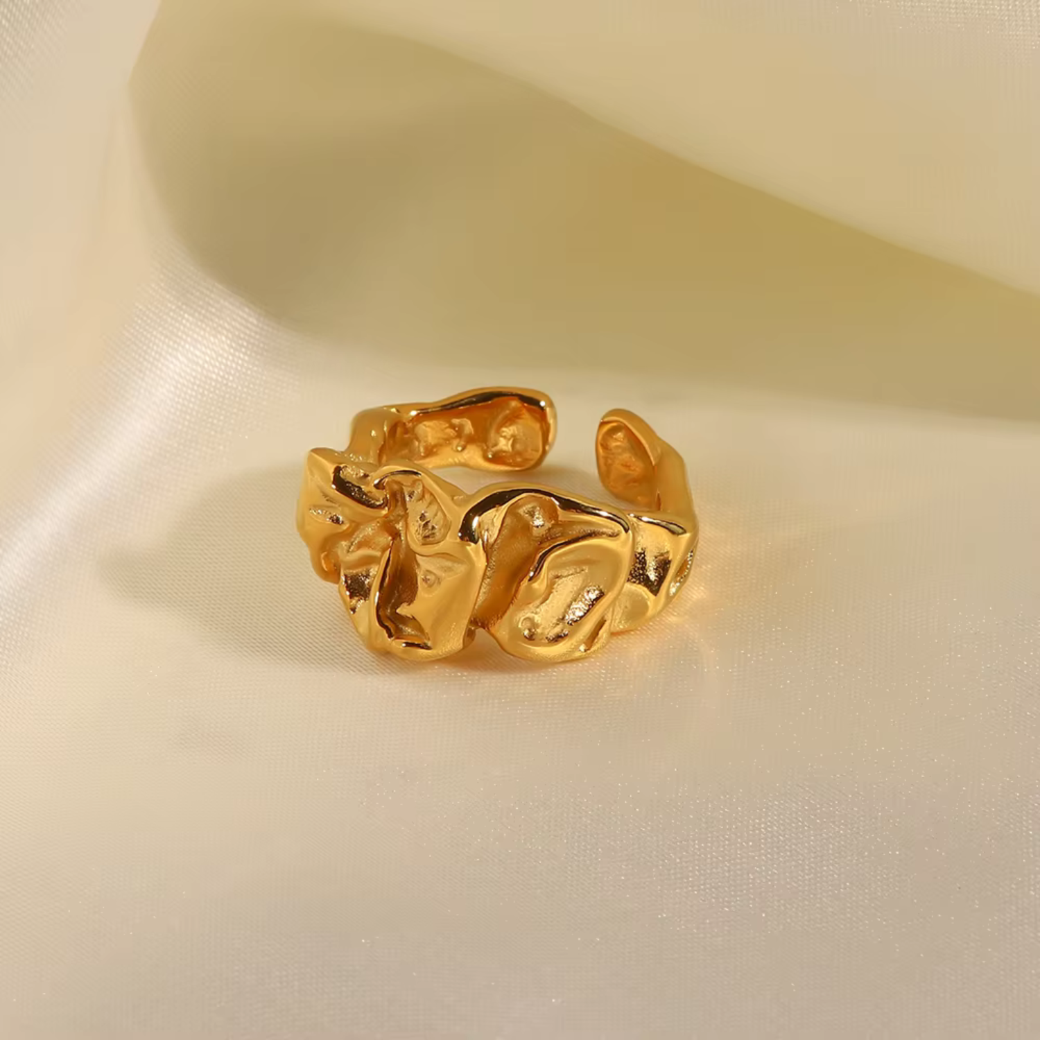A bold sculptural piece with flowing molten textures and timeless elegance. The Mira Ring is crafted in polished gold-tone stainless steel for a statement that’s both artistic and wearable.